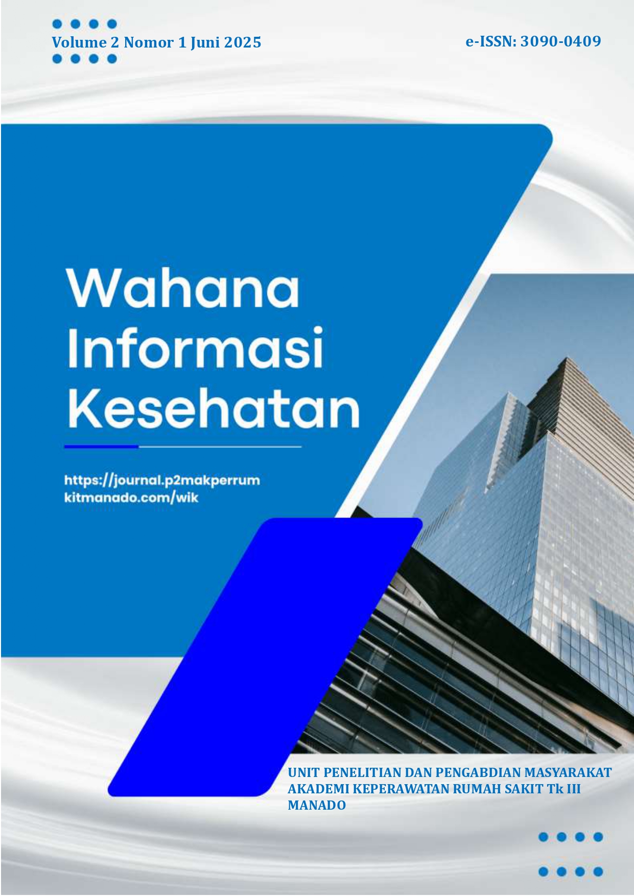 Jurnal Wahana Informasi Kesehatan diterbitkan oleh Unit Penelitian dan Pengabdian Masyarakat (P2M) Akper Rumkit Tk. III Manado merupakan salah satu jurnal peer-review yang berkontribusi dalam mempublikasikan dan menyebarluaskan ilmu pengetahuan hasil karya tulis ilmiah dari berbagai rumpun ilmu Kesehatan. Jurnal informasi kesehatan terbit secara berkala dua kali dalam setahun yaitu pada Bulan Juni dan Bulan Desember. Untuk Volume 2 Nomor 1 terbit pada Bulan Juni 2025